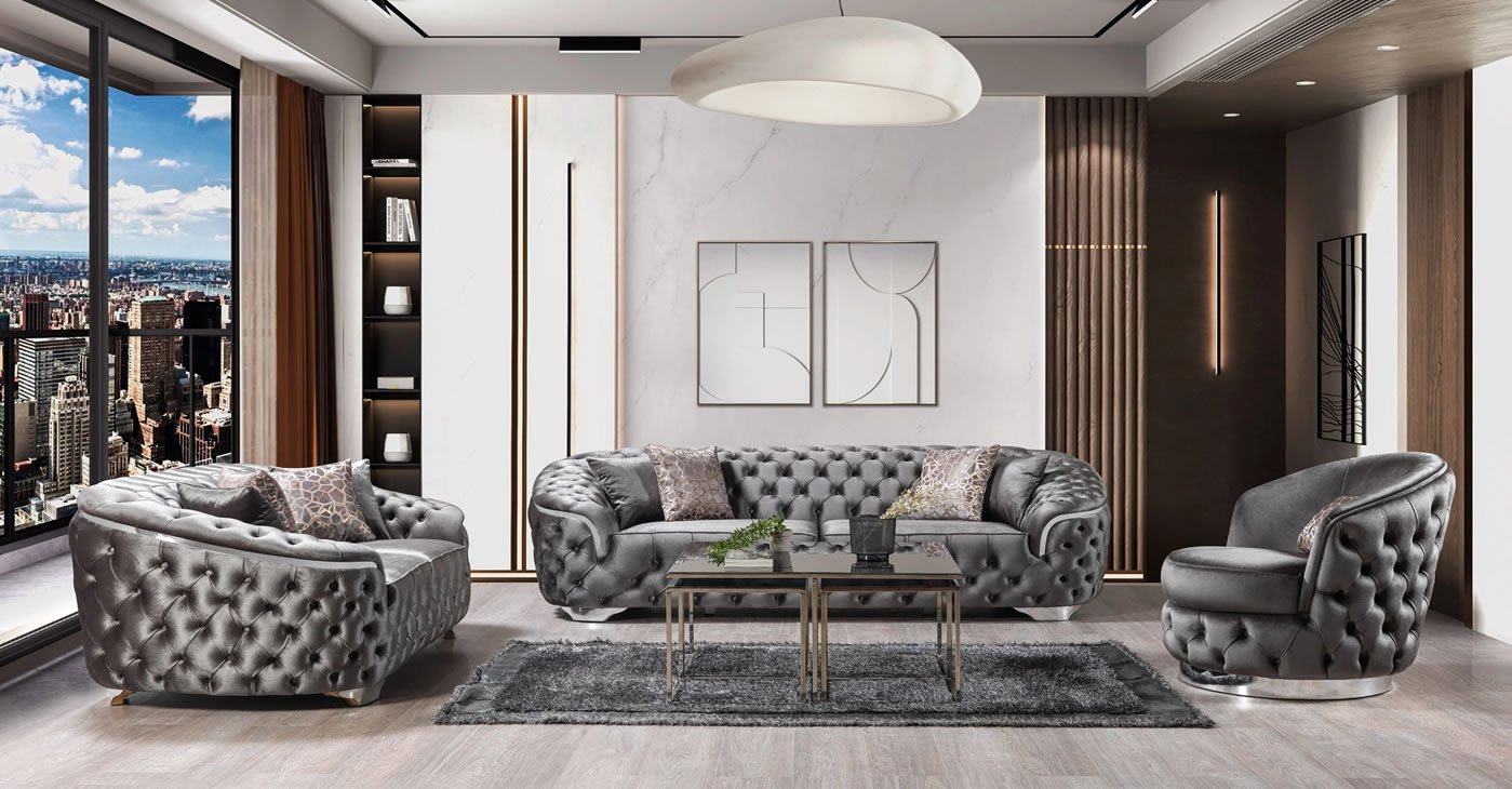 Our product: 3+2+1 Set. 32 Density - Fabric: Velvet & Babyface, Hornbeam plywood frame is used. Leg assembly is required. | Can be designed according to desired fabric and color options. For more furniture types, you can visit our Turkey factory furniture sales site. | mobilyadostu.com | Factory production and export registration. Logistics and installation are not included in the price. | For retail sales, you can visit our online furniture sales store b11.com.tr.